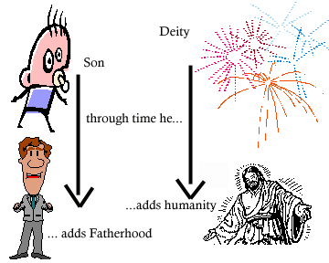 This can be compared to the father-son identities we experience. When a man is born he experiences the role of a son. Although He knows the role of father exists, he has no personal experience of it. Through the process of time he can add the role of fatherhood to his identity. Then he is both a son and a father. His added identity as a father does not negate his identity as a son, but simply adds a role with its corresponding characteristics to his existing role as a son.